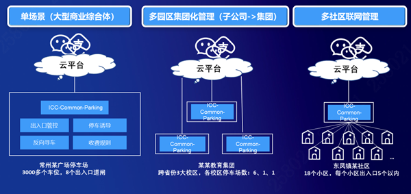 “基于多个跨区域的停车场,例如集团化管理的子公司,需要管理多个区域的办公停车场,可多个子公司分别部署一套ICC-Common-Parking停车系统,每个区域通过联网网关接入云平台,实现对接入的多个区域的停车场管理。